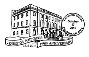 The souvenir pictorial postmark features an elevation of the historic Post Office building and a ribbon reading: “Pendleton Post Office 100th Anniversary.” The special postmark will be applied at no charge on any stamped envelopes or cards customers bring in during Monday’s event. Postmarked items will serve as unique mementos of the celebration.