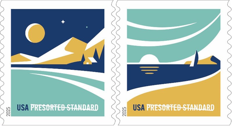 Greg Breeding, an art director for USPS, designed the stamps using art from DKNG Studios. “For Presorted Standard stamps, we like to showcase broadly appealing imagery from across America,” says Breeding. “These two paintings have a kind of Americana feel by displaying both mountains and the shore, both iconic to the American landscape. Because of their unique design style and use of color, the images come off as very fresh and engaging.”