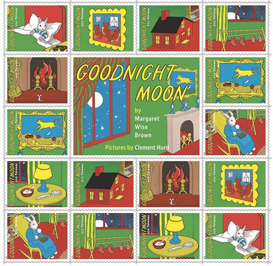 Derry Noyes, an art director for USPS, designed the pane using Clement Hurd’s illustrations. As Forever stamps, the Goodnight Moon stamps will always be equal in value to the current First-Class Mail 1-ounce price.