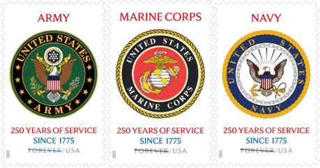 The U.S. Postal Service to proudly unveil three individual commemorative stamps honoring the 250th anniversaries of the U.S. Army, U.S. Navy and U.S. Marine Corps, recognizing the enduring legacy and unwavering dedication of these vital branches of the American military.