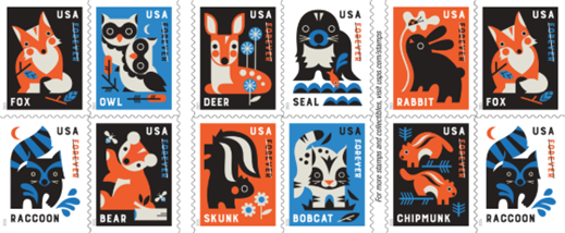 The stamps showcase 10 designs, including a fox, owl, deer, seal, rabbit, raccoon, bear, skunk, bobcat and chipmunk — each rendered with clean lines, rich textures, and a warm, modern palette of rust orange, cornflower blue, pale ecru and soft black.